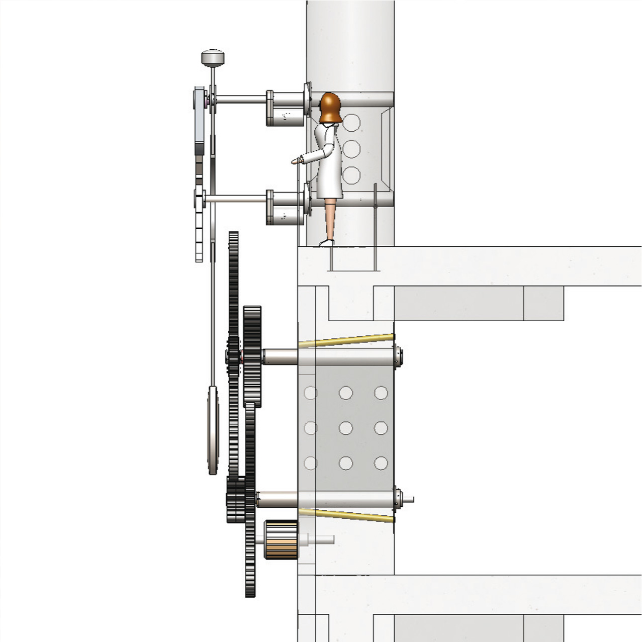 Ce système sera le « cœur qui bât » au sein de la gare ; par son mouvement de va et vient, il sera la partie vivante et horlogère dont le déplacement est aussi pertinent dans sa dimension animée que le rotor en rotation du moteur de la motrice du TGV.