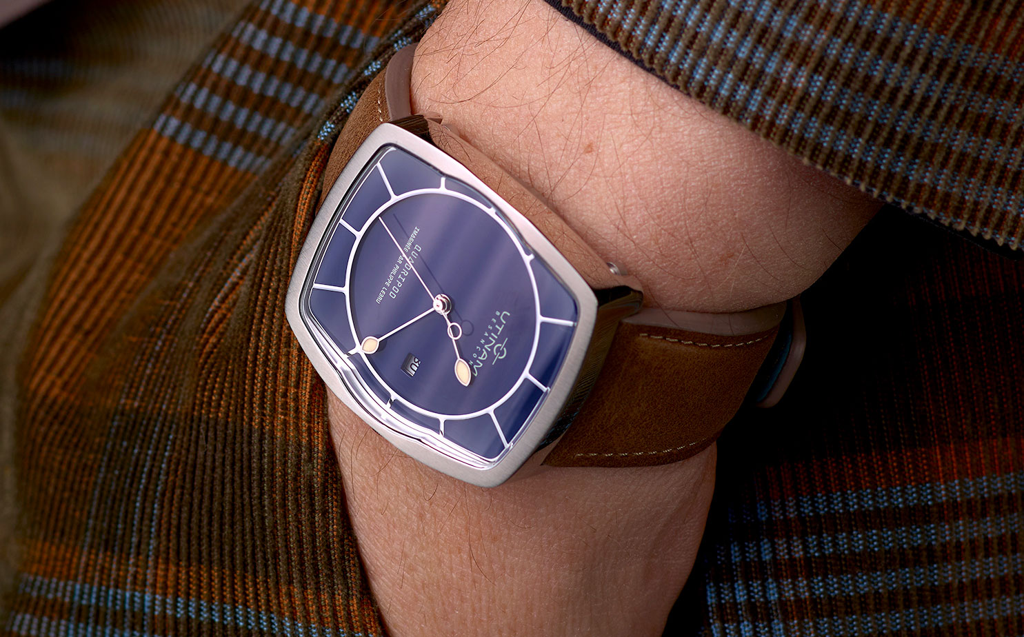 Tel un Ovni posé sur quatre pilastres, chaque montre de la collection QUADRIPOD surprend par l’élégance étrange de sa forme chic, glissante sous un galbe de verre saphir qui cherche et trouve sa place entre 3heures et 9heures.